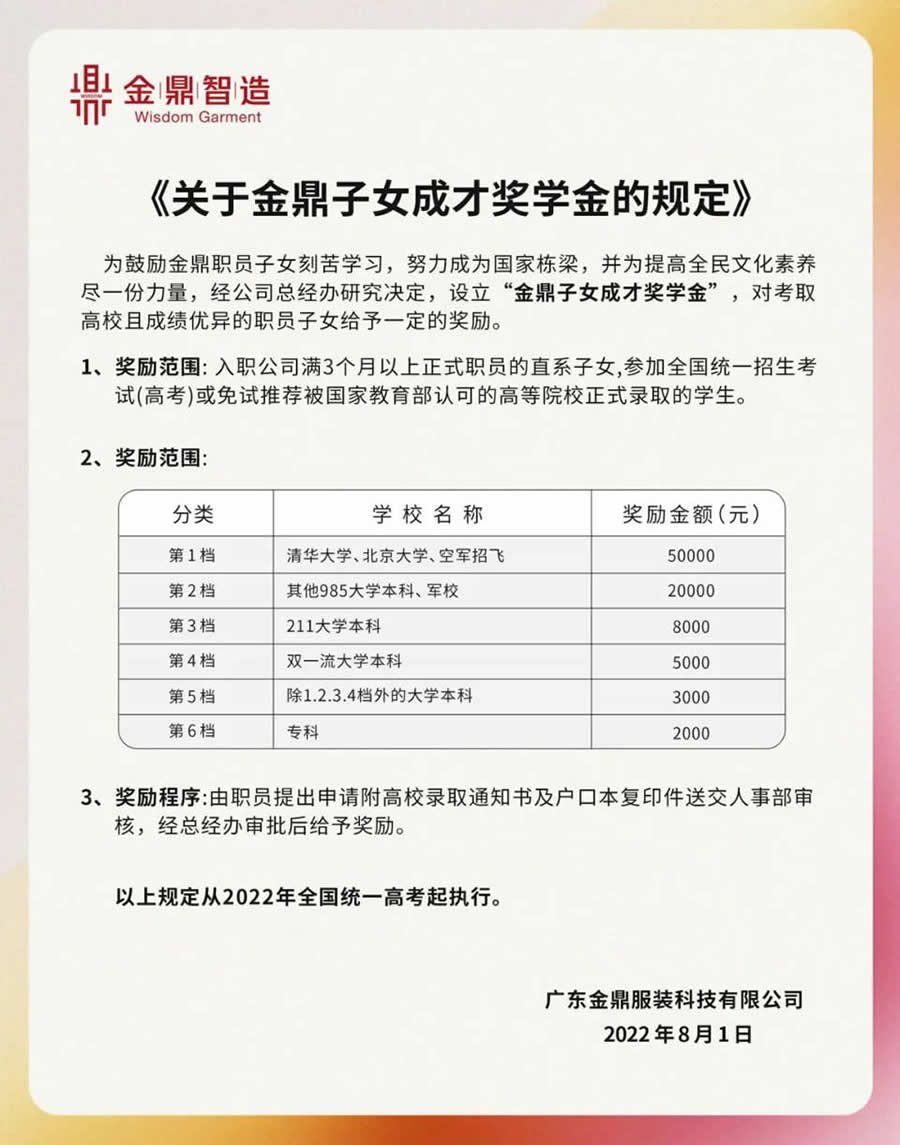“在金鼎智造,我們始終相信,支持職工子女教育不僅是對員工的關懷,更是對企業未來和社會發展的責任與擔當。教育是改變命運的鑰匙,是點燃夢想的火種。每一位職工的子女,都承載著家庭的期望與社會的未來。